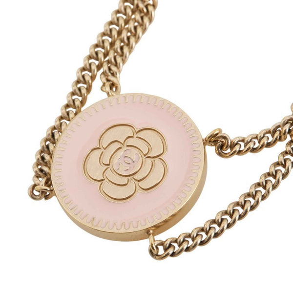 Vintage Chanel Camellia Coco Mark Round Chain Bracelet in Gold and Pink Plated for Women