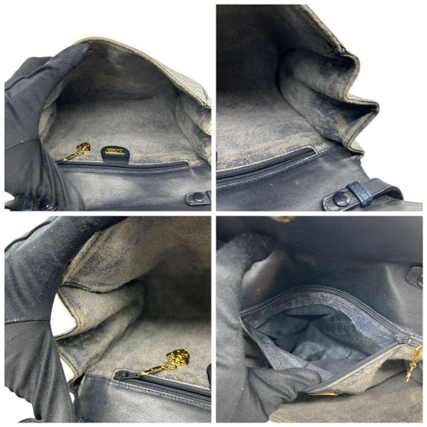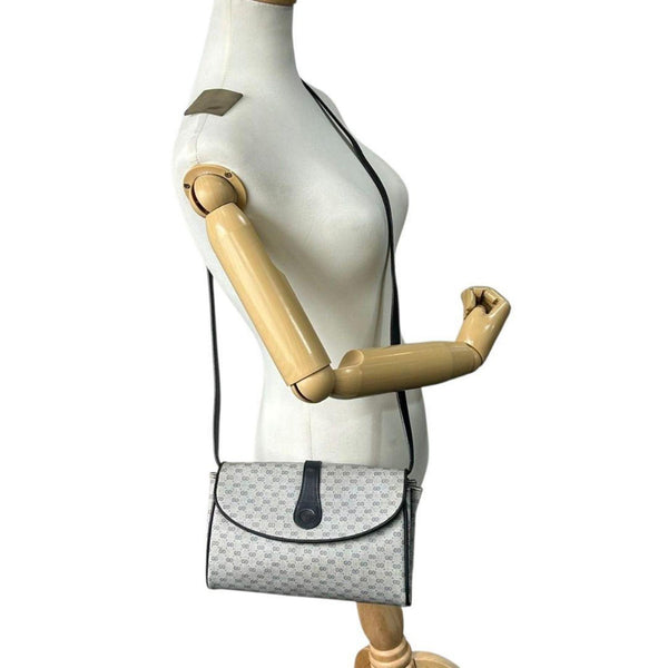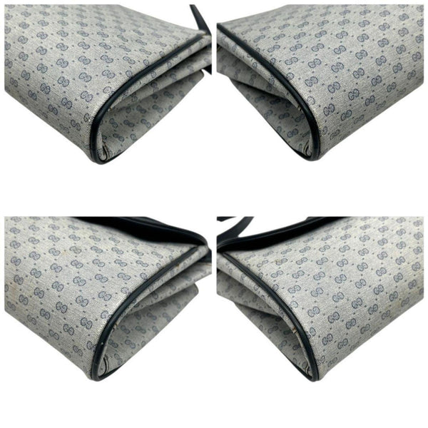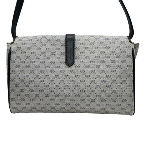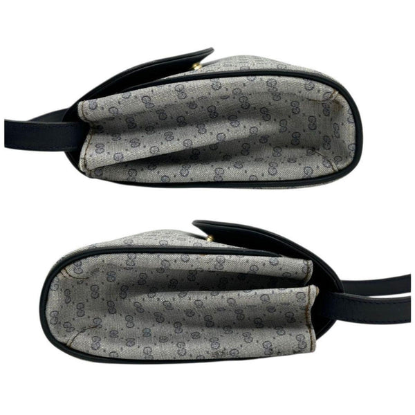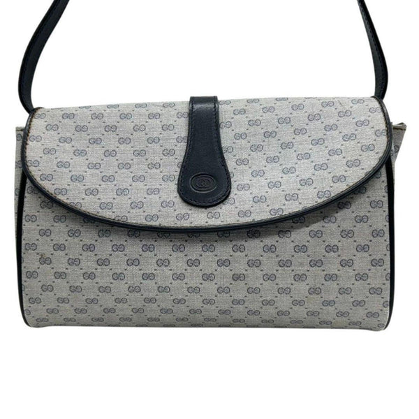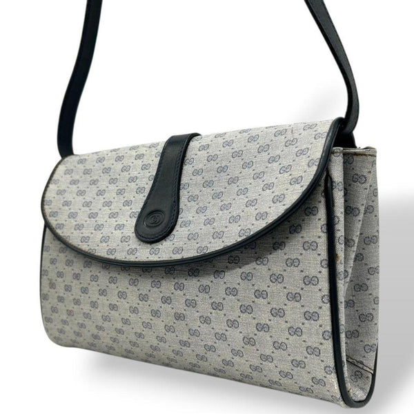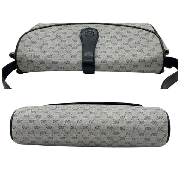 Vintage GUCCI Micro GG Shoulder Bag in Navy Blue Leather with Flap, Crossbody Attachment, Gold Hardware, Logo Plate, and Crest Logo.