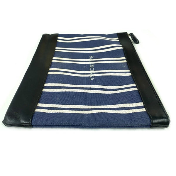 BALENCIAGA 420407 Stripe Logo Navy Clip M Large Pouch/Clutch Bag in Canvas/Leather, Unisex, and Black