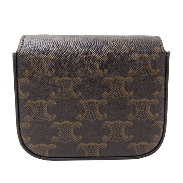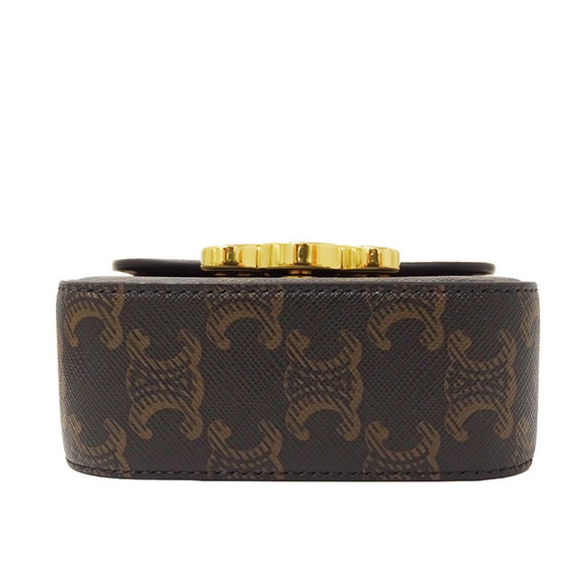 Celine Triomphe shoulder bag, dark brown, mini compact, with logo and perfume.