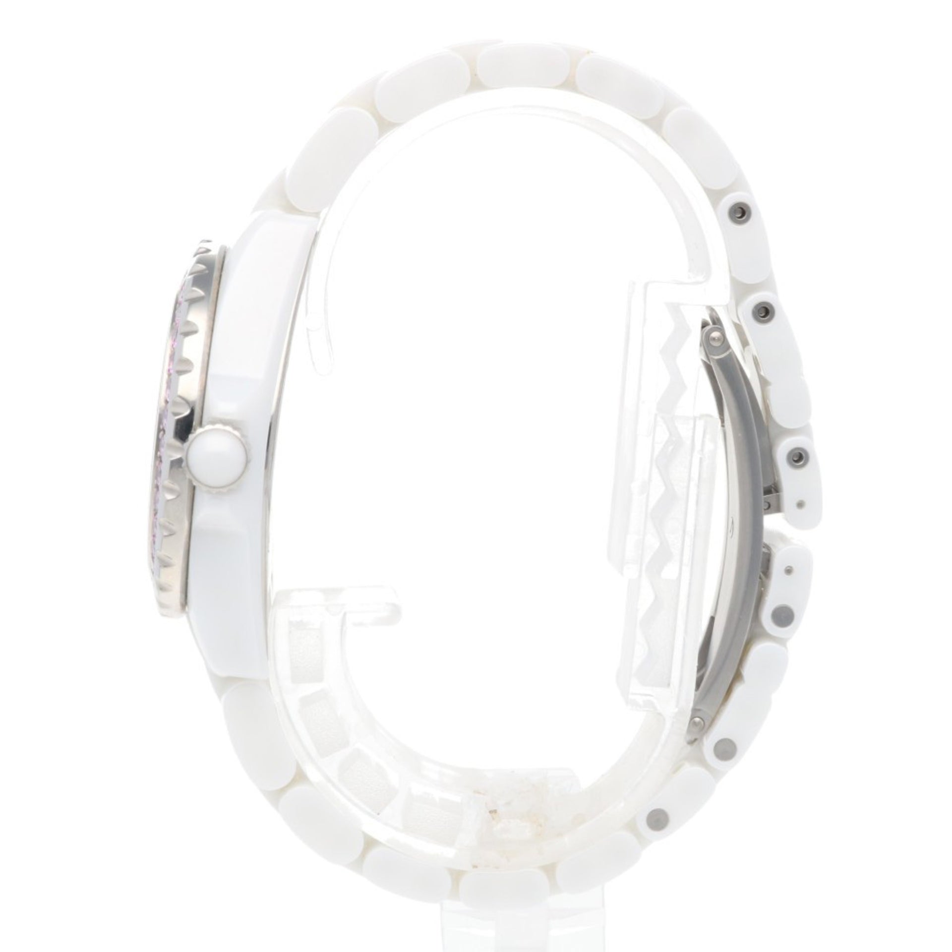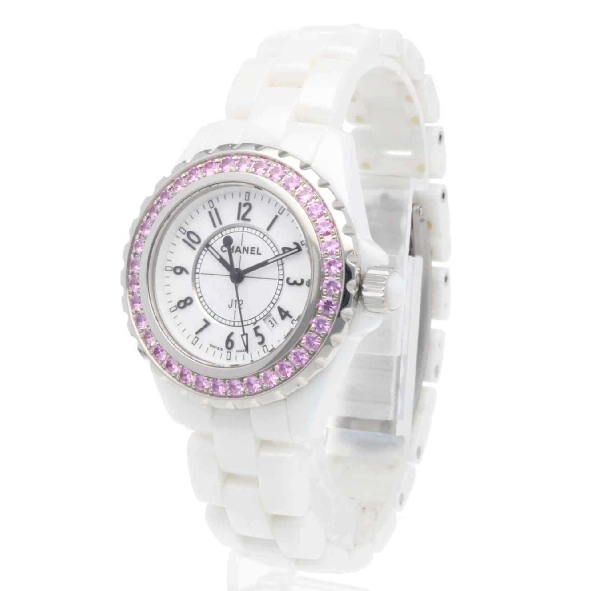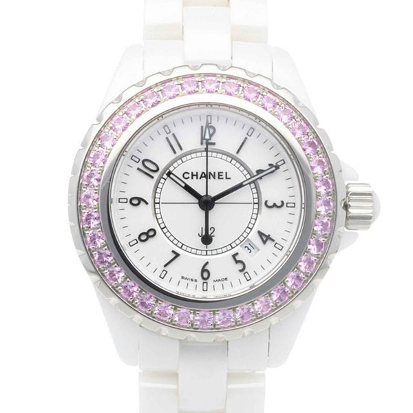 Chanel J12 Watch, White Ceramic H1181 Quartz, Women\'s, Pink Sapphire Bezel