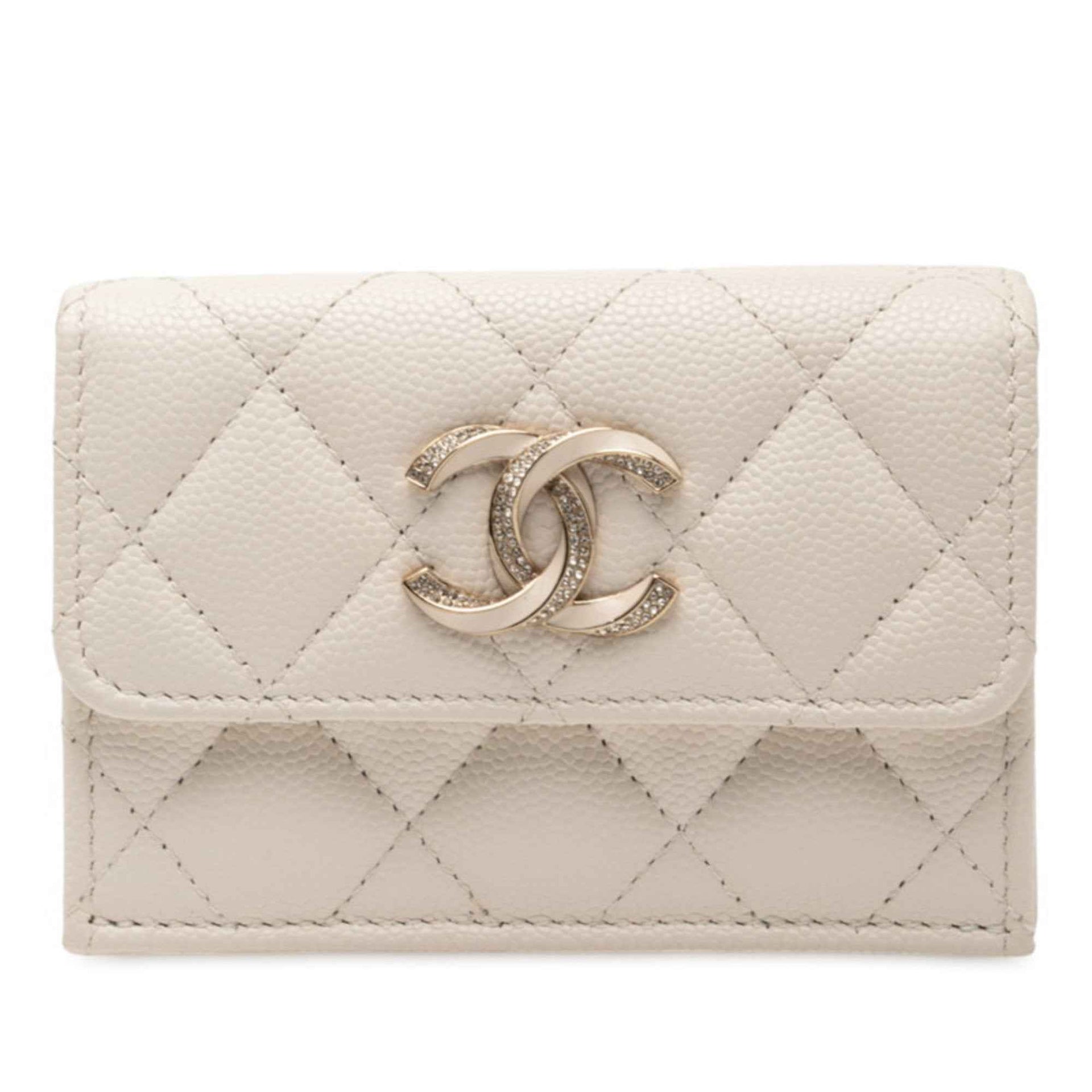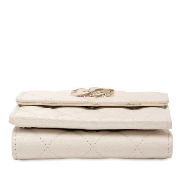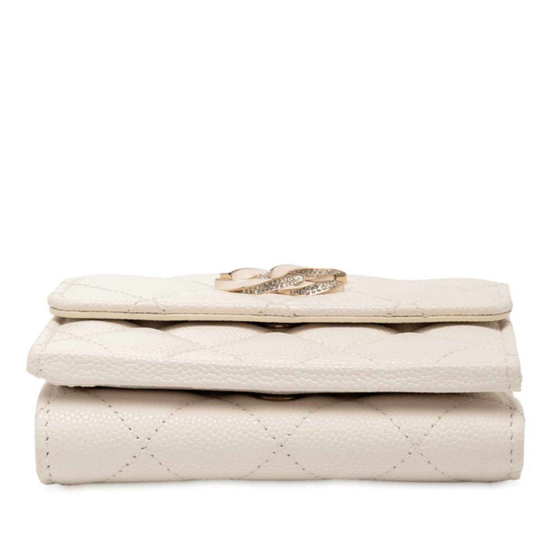 CHANEL Matelasse Coco Mark Rhinestone Tri-fold Wallet in White Caviar Leather for Women