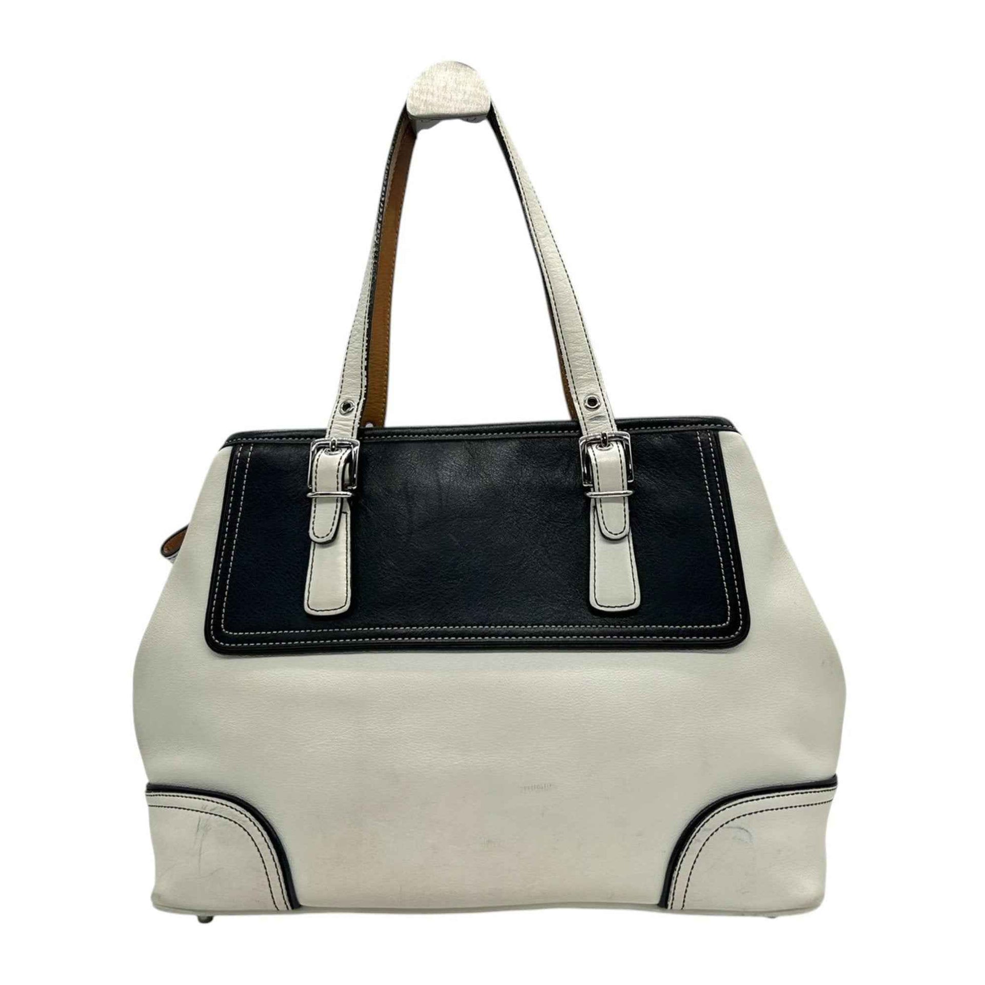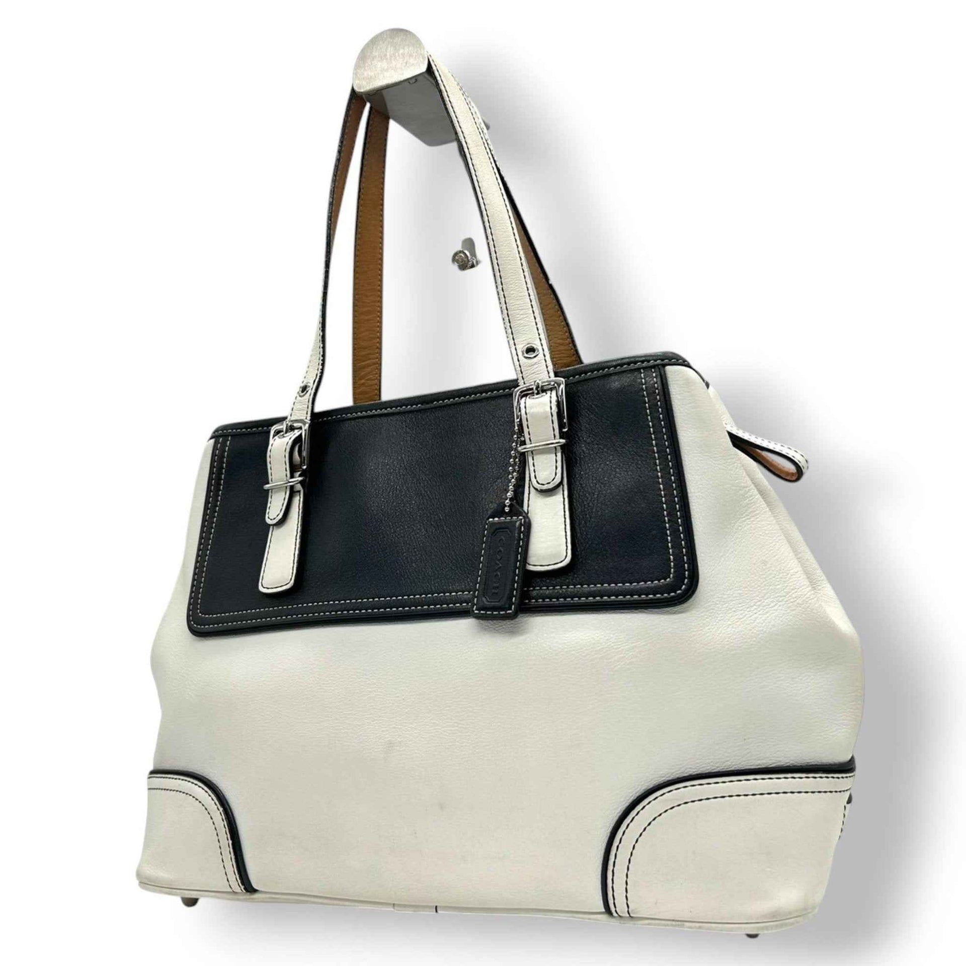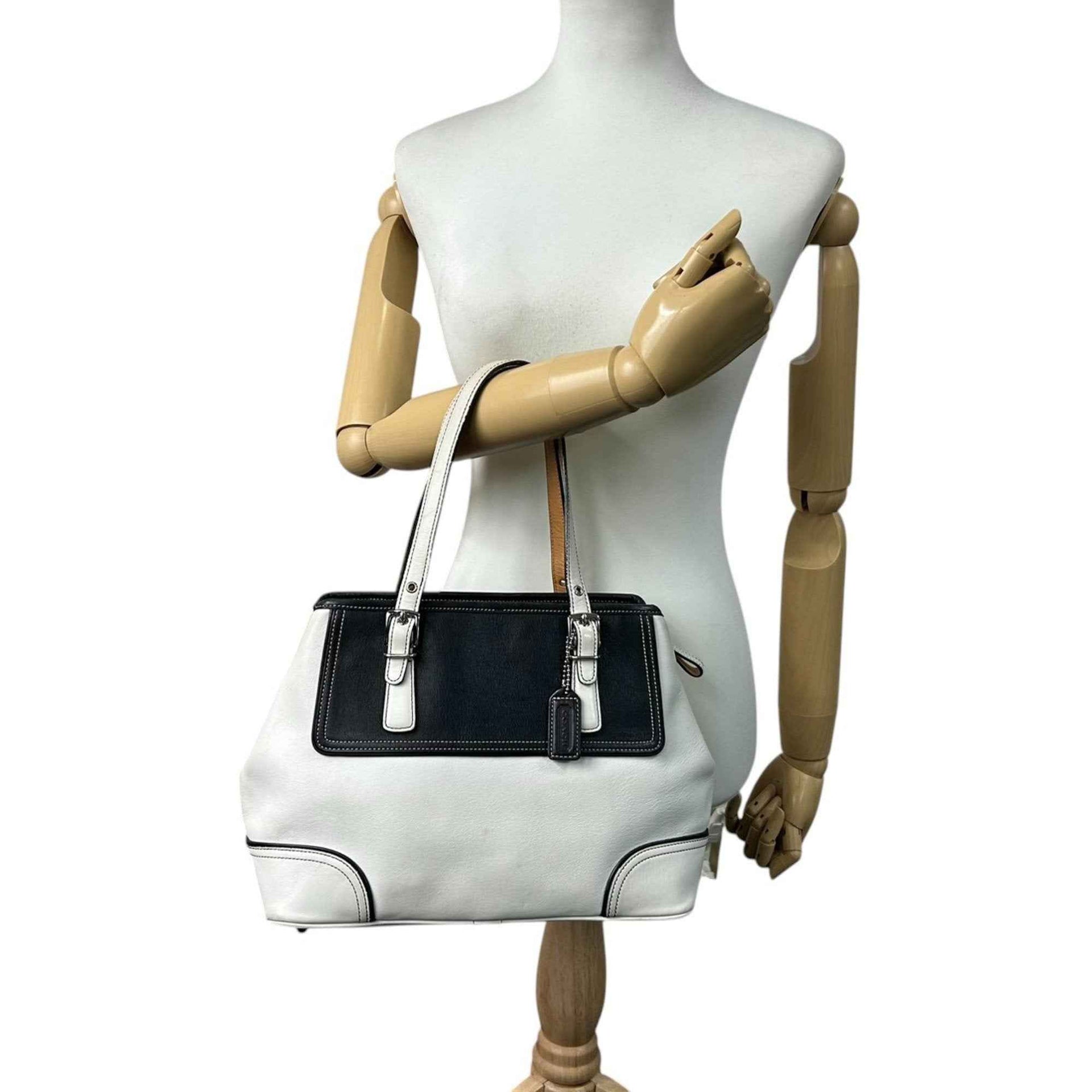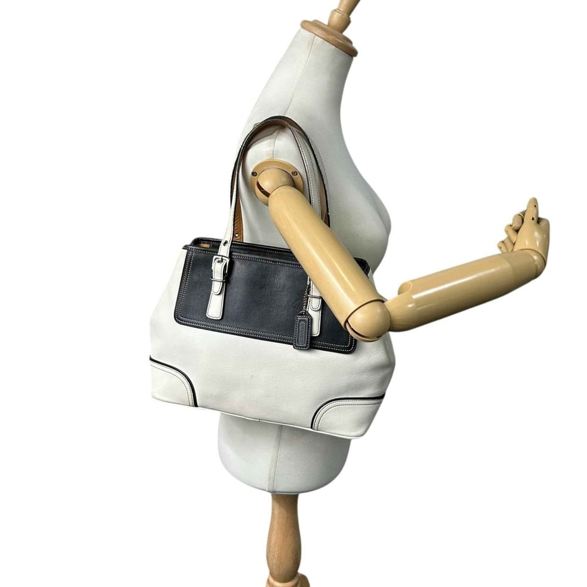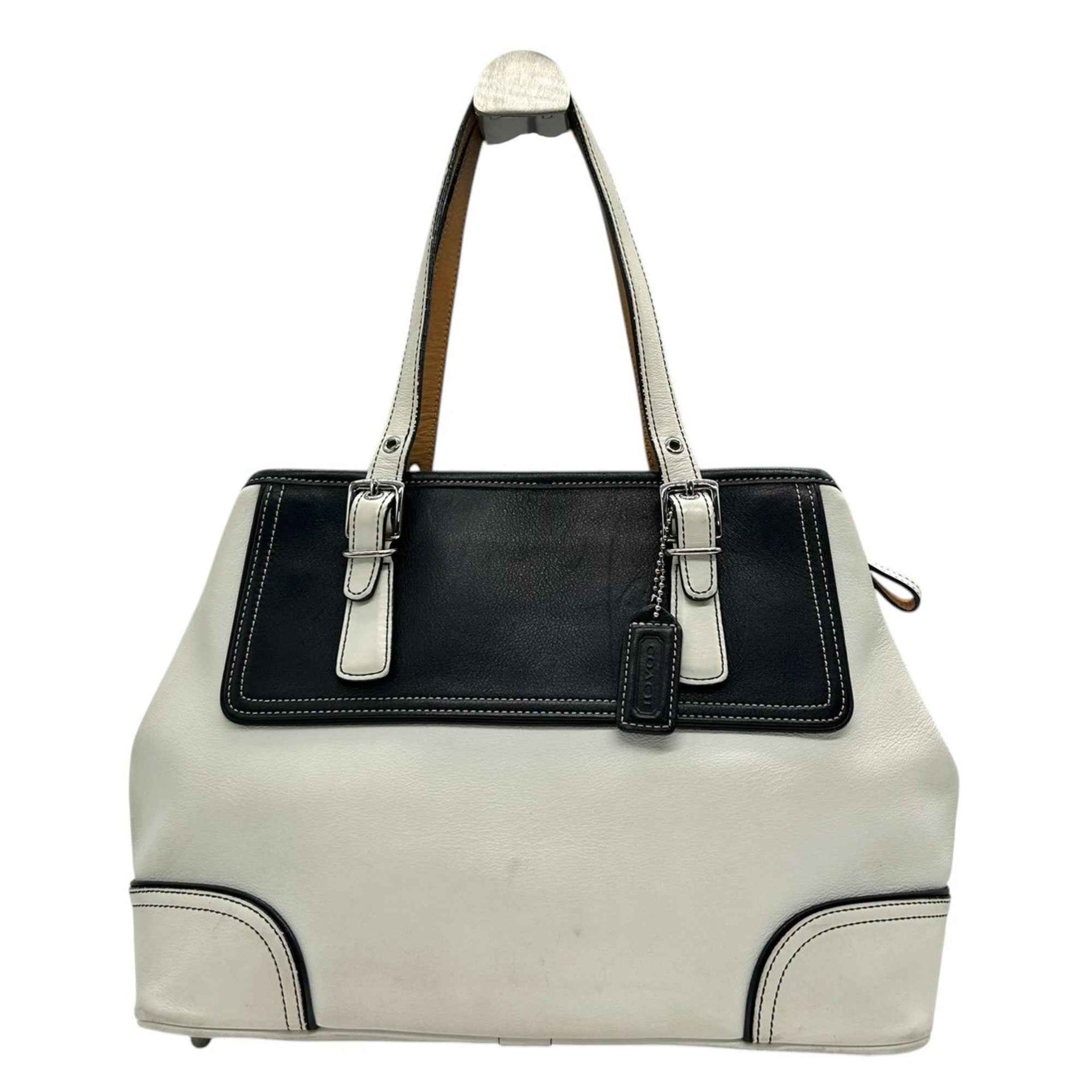 Coach 9605 Leather Tote Bag, White and Black, Two-Tone, One-Shoulder, Women\'s Handbag with Charm, Size s53