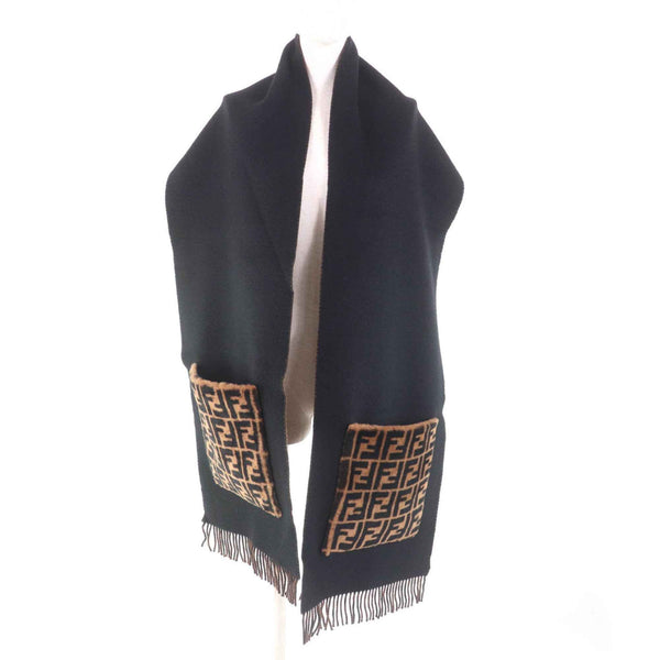 FENDI FXT252 Cashmere Blend Zucca Print Scarf with Fur Pocket and Fringe, Black/Brown, Includes Dust Bag, Made in Italy, Women\'s