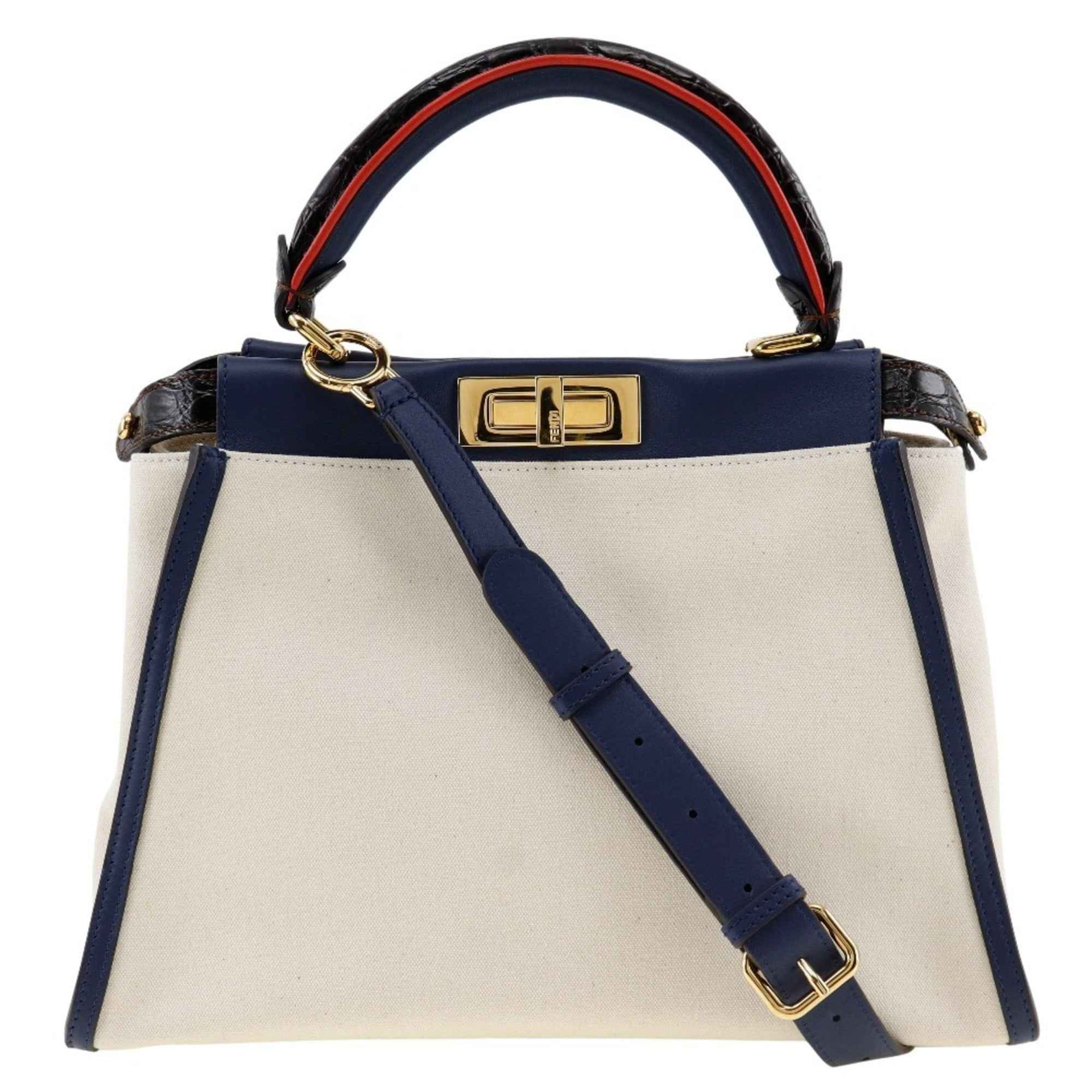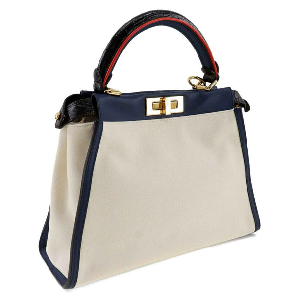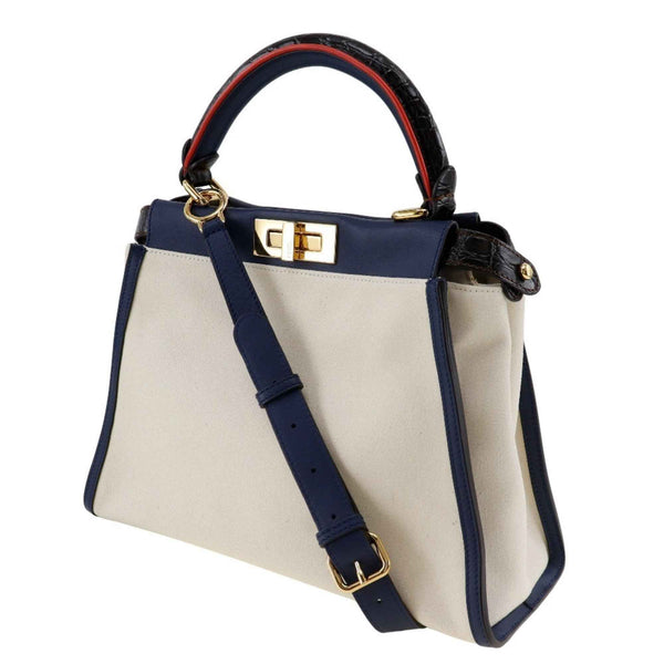 FENDI Peekaboo handbag shoulder bag 8BN290 canvas x calfskin white/navy 2way A5 turn lock women\'s