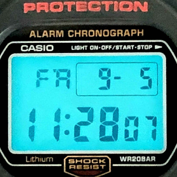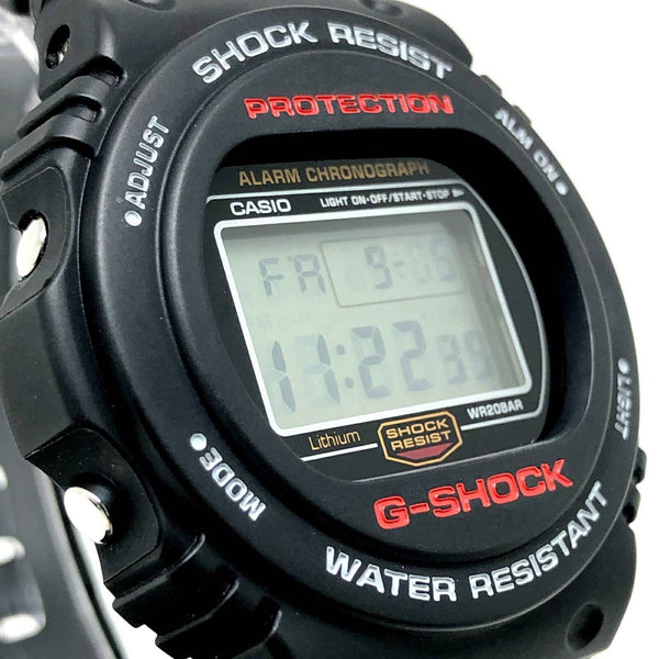 G-SHOCK CASIO DW-5700-1 Watch, a reproduction of the original Sting model, with mirrored finish, screw-down case, and EL backlight. DW-5700C replica released in August 2001. Available at Mikunigaoka store. Product code: IT41Z9P84E30.
