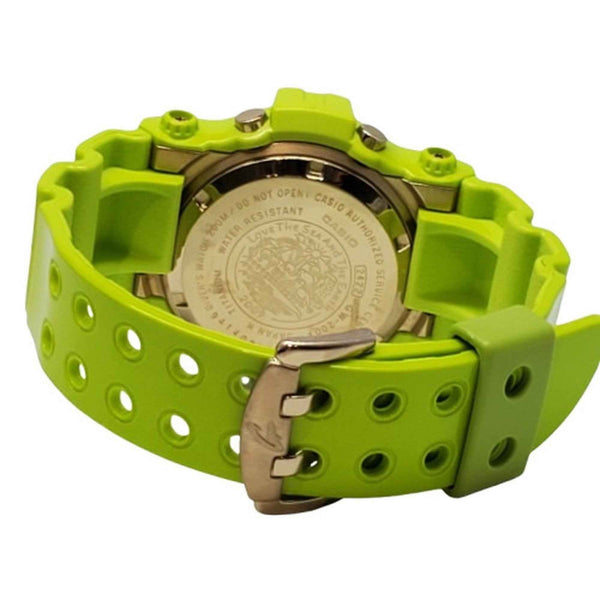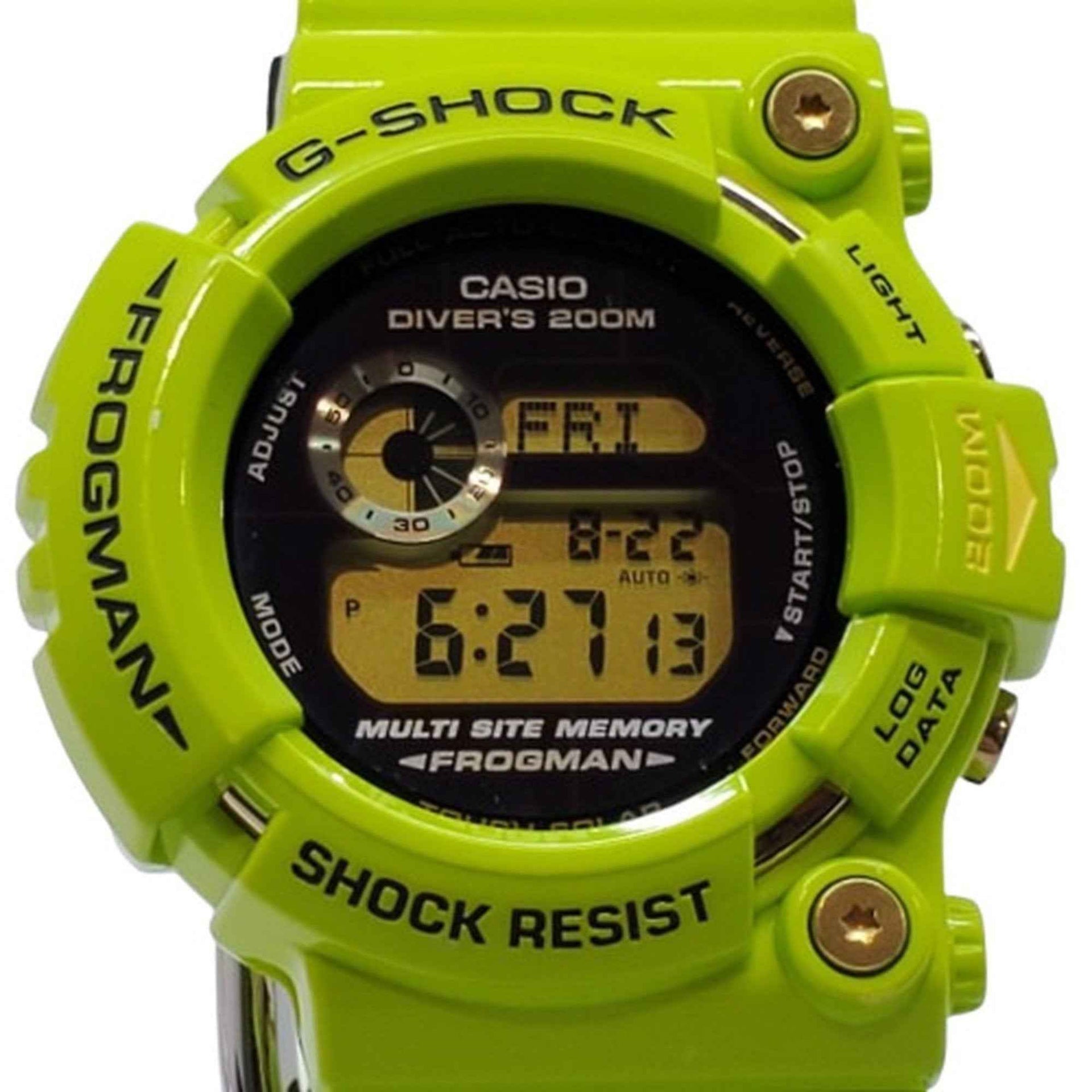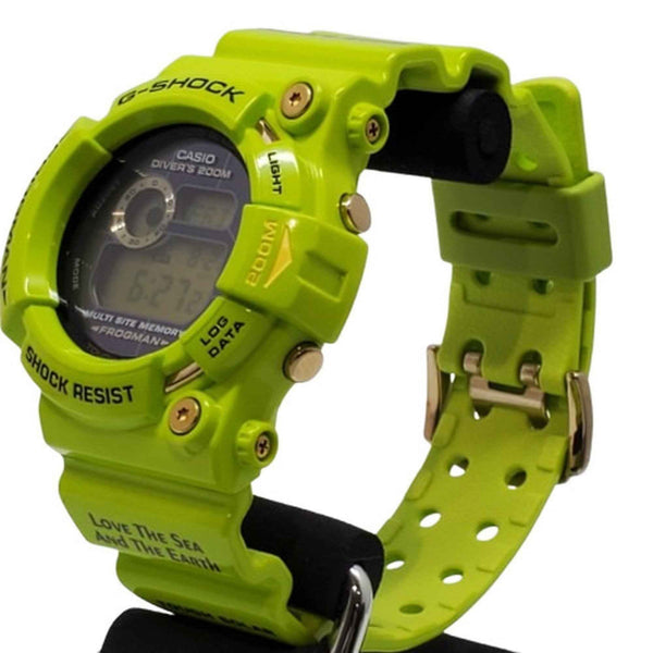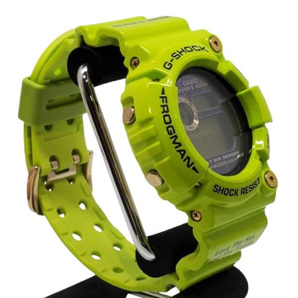 G-SHOCK CASIO Frogman GW-200F-3JR watch, 2009, featuring a dolphin, whale, tree frog, and leaf design in lime green. Tough Solar. Men\'s. Available at Kaizuka Store.