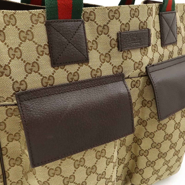 GUCCI GG Canvas Sherry Line Tote Bag, Large Shoulder Leather, Khaki Beige, Dark Brown, 161836