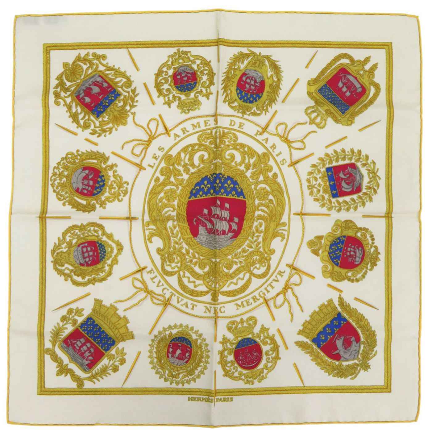 Hermès Carré 45 Petit Paris Coat of Arms LES ARMES DE PARIS Silk Cream Gold Red Scarf Muffler 0155 HERMES
