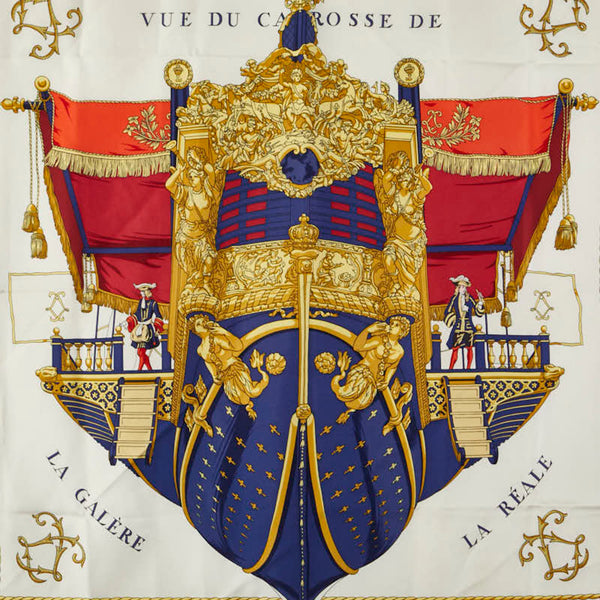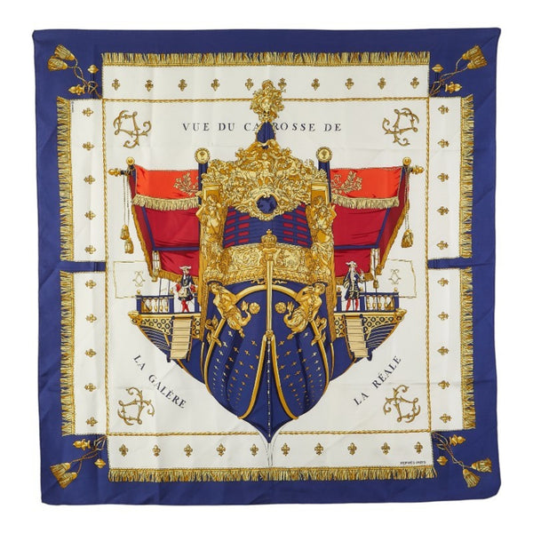 Hermes Hermès Carré 90 \"VUE DU CAROSSE DE LA GALERE REALE\" Queen\'s Coronation Scarf, Blue, White, Multicolor, Silk, Women\'s