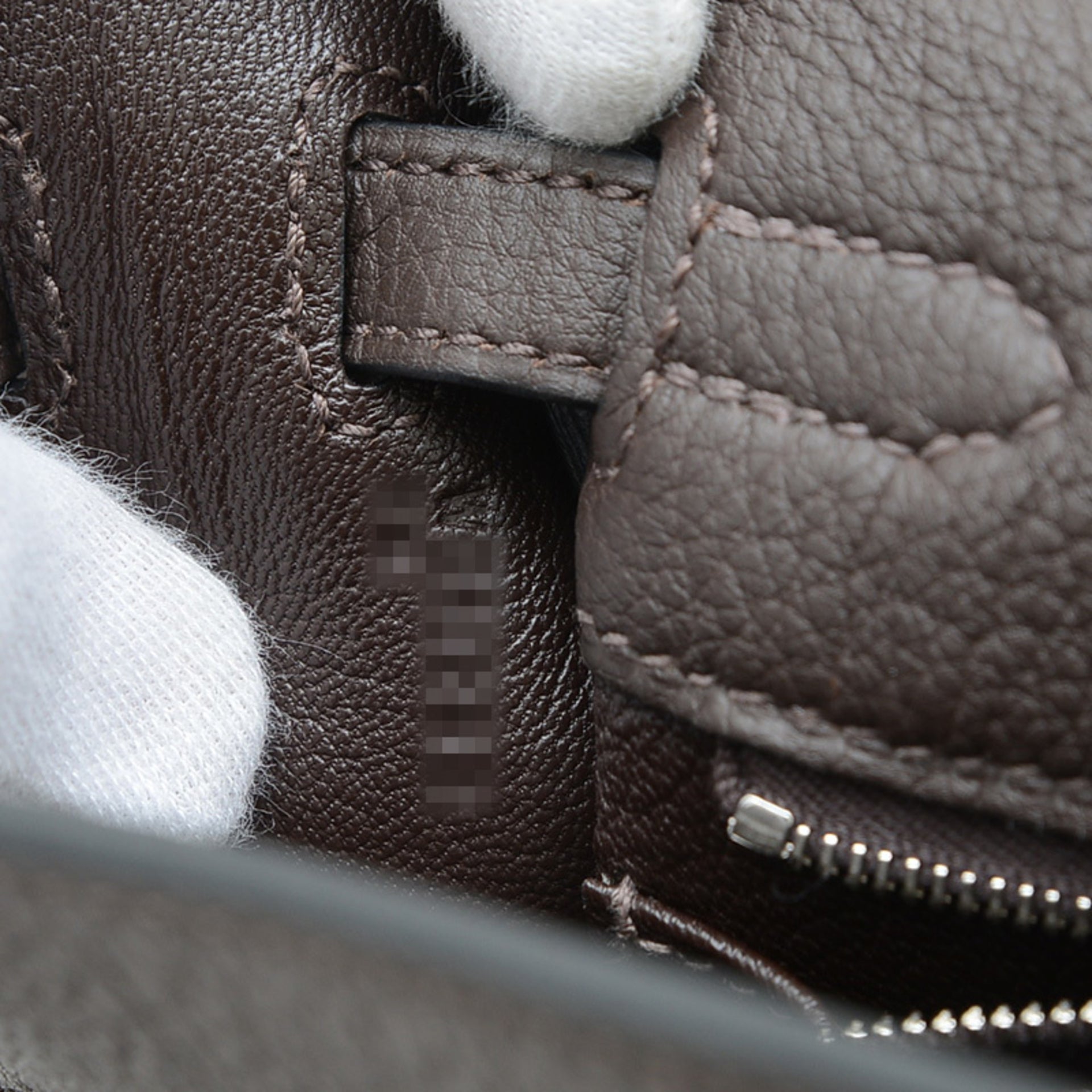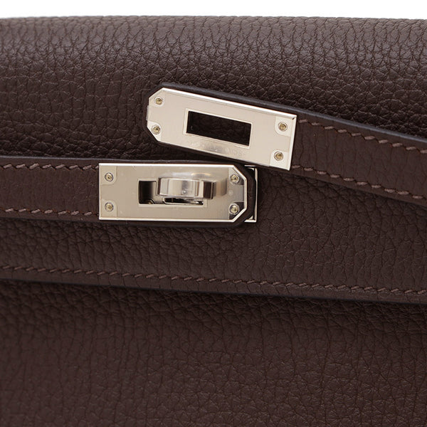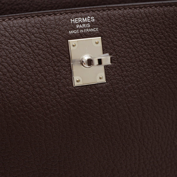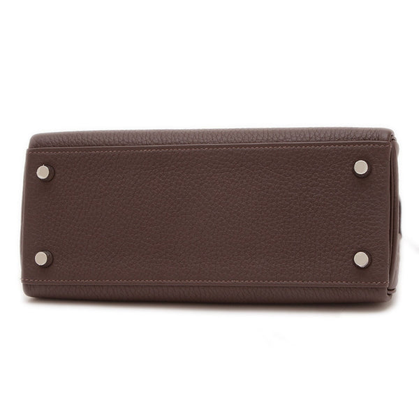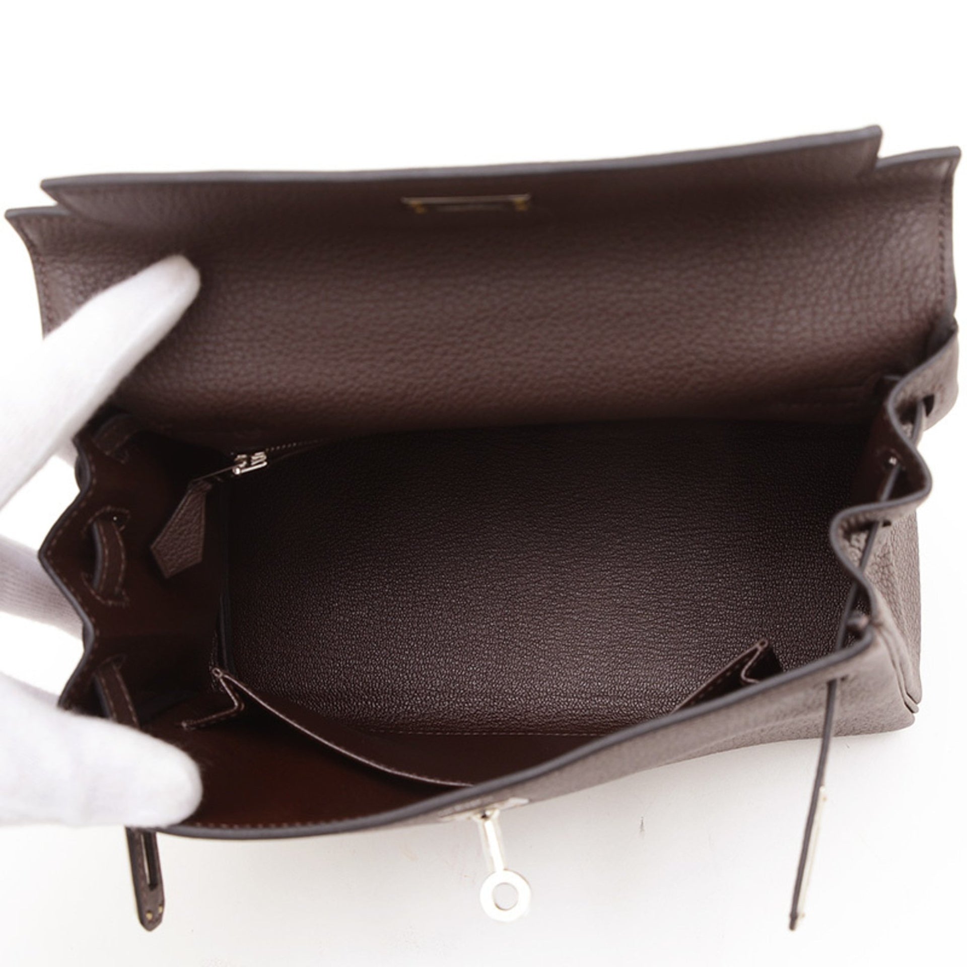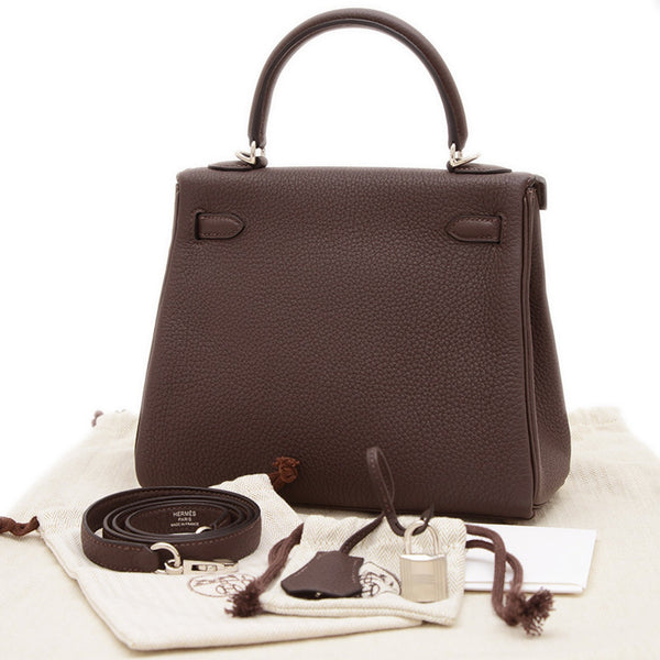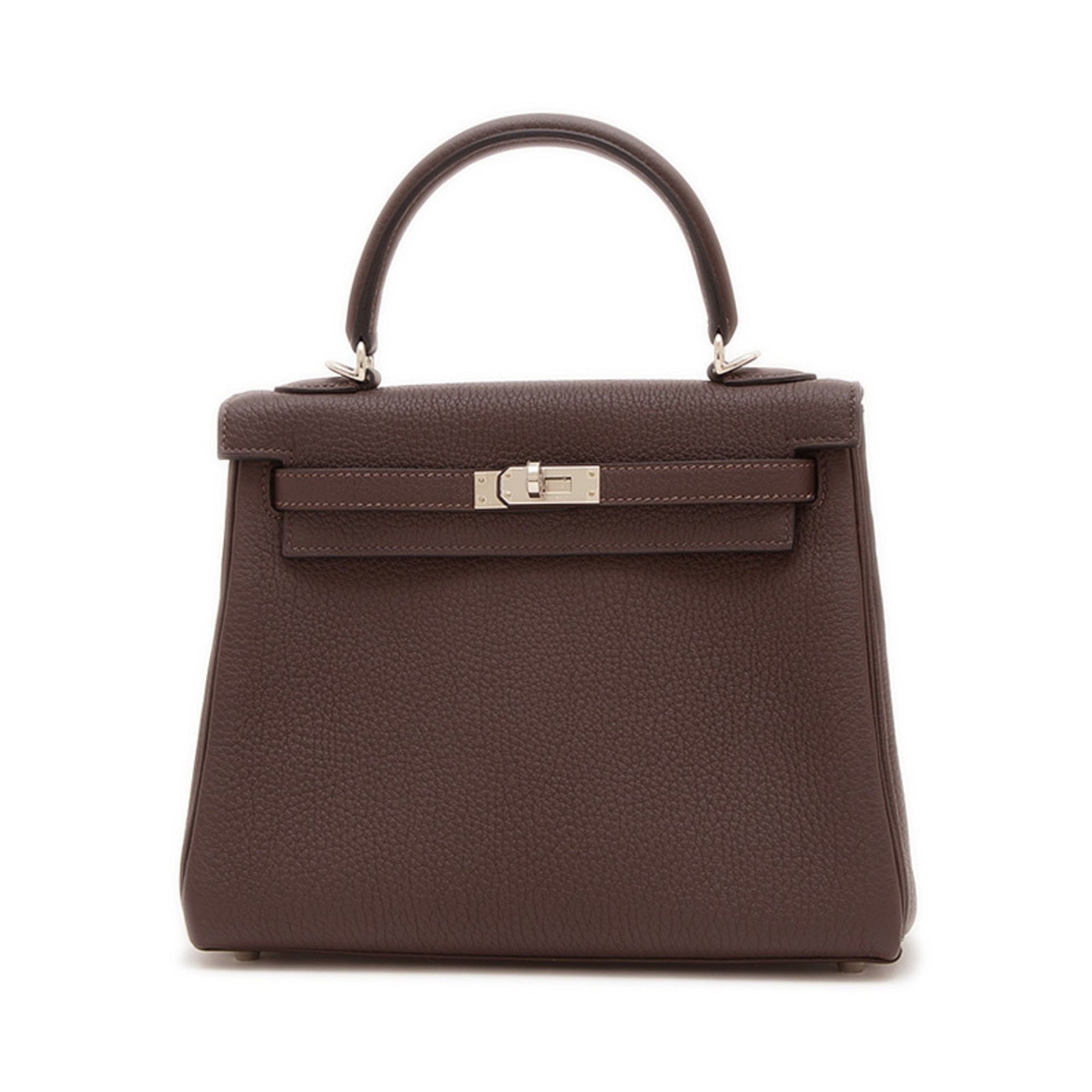 Hermes Hermès Kelly 25 handbag with inner stitching, Togo chocolate leather, silver hardware, and double stamp.