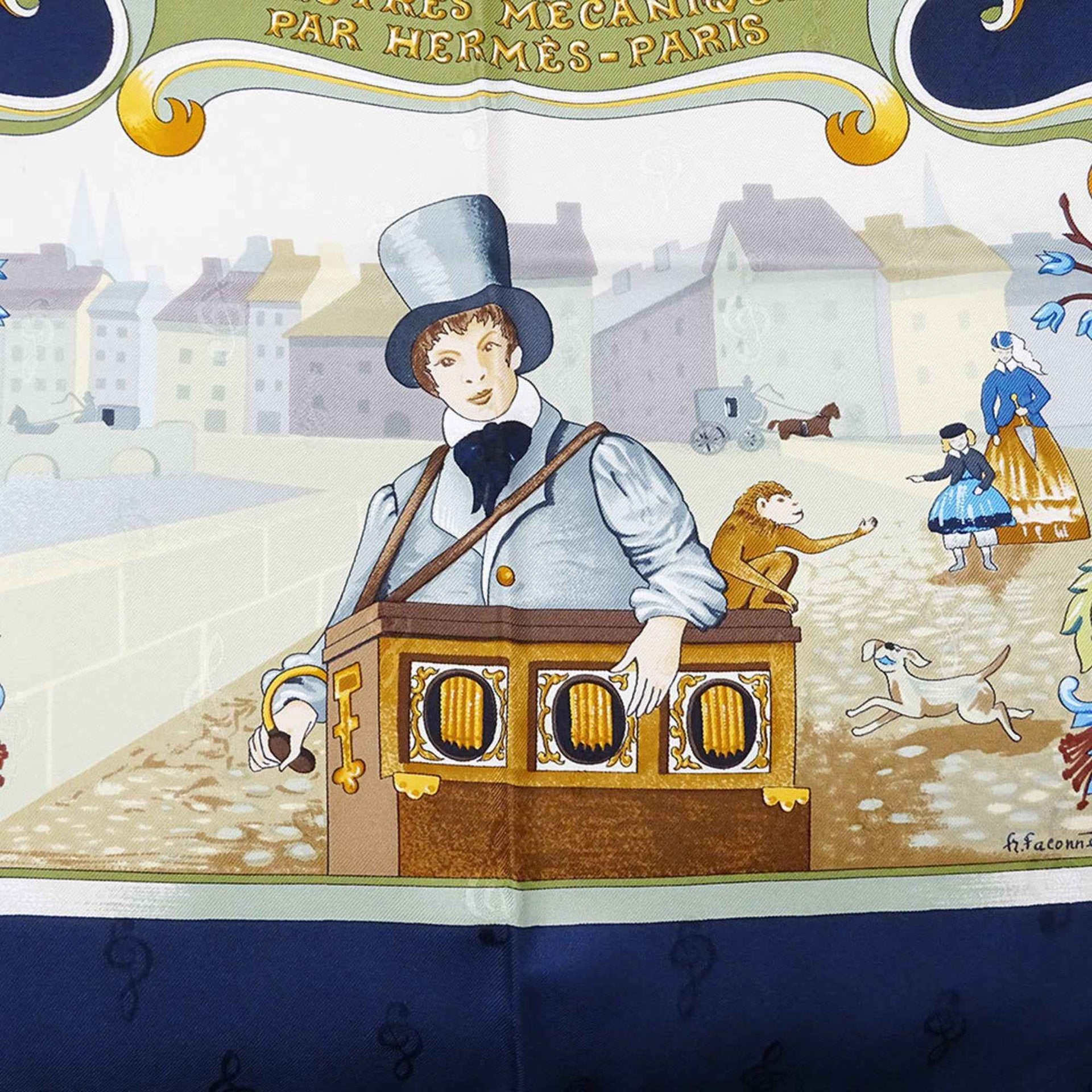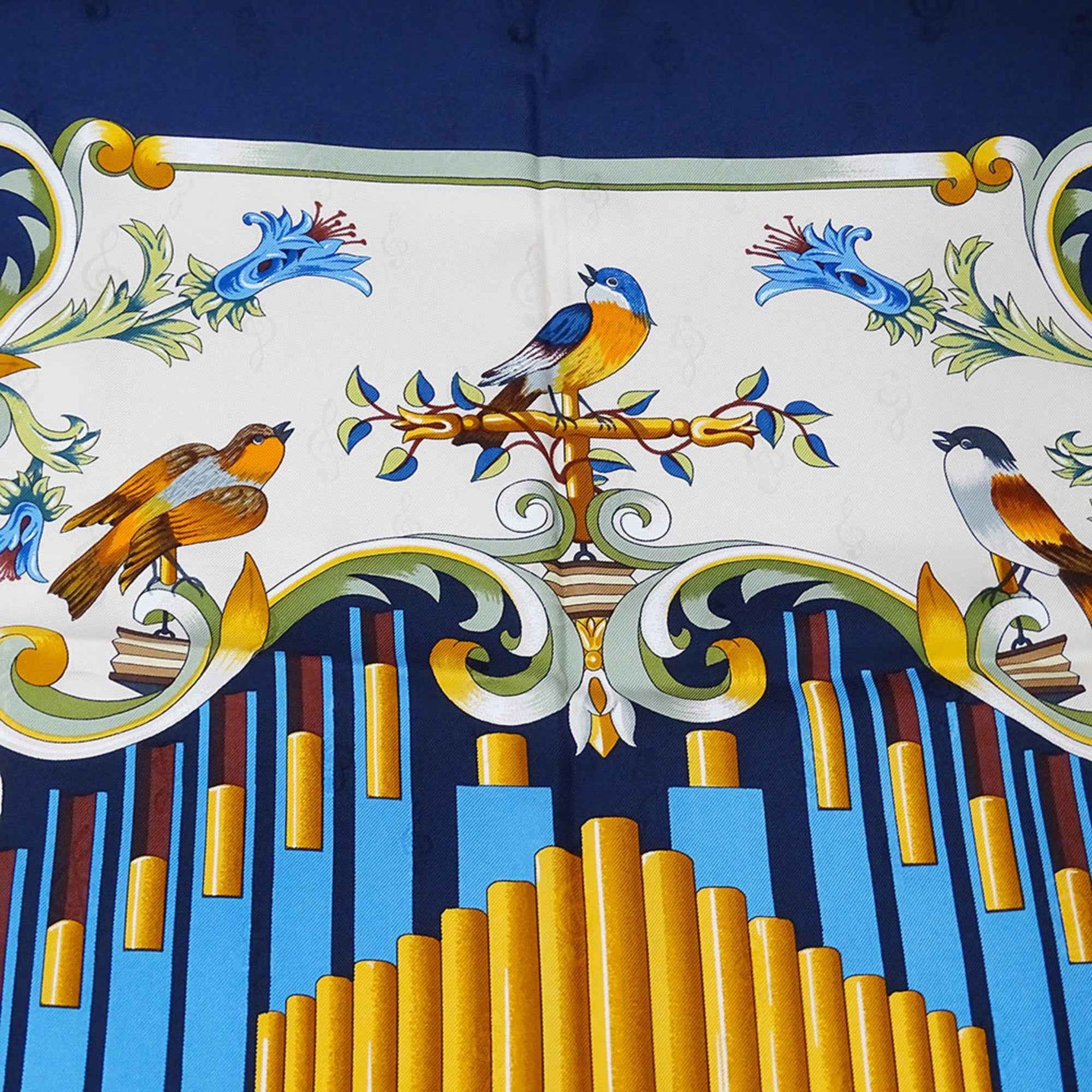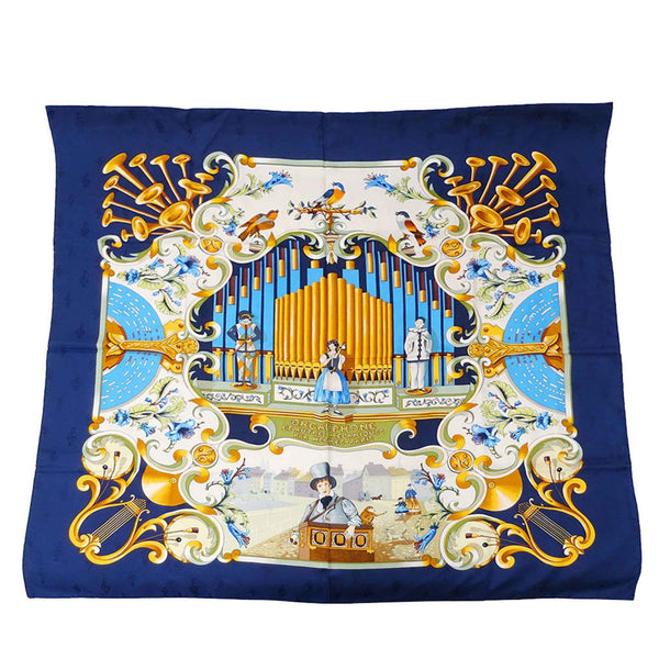 Hermès HERMES scarf/muffler for women, brand Carré 90 ORGAUPHONE ET AUTRES MECANIQUES, pipe organ and clockwork instrument, silk, navy, large size.