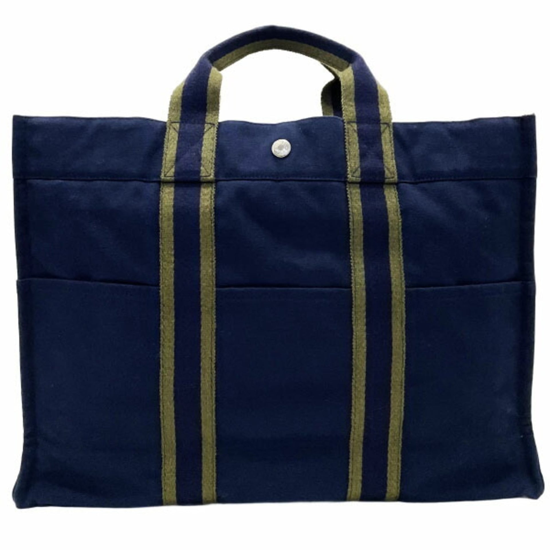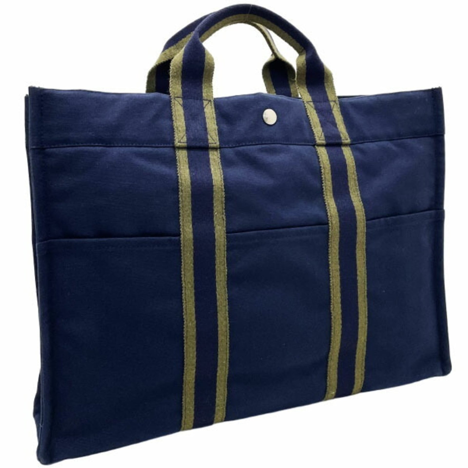 Hermes Tote Bag Foule MM Canvas Navy Khaki Green Bicolor Handbag Men Women Unisex AHN-13595