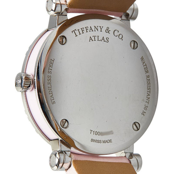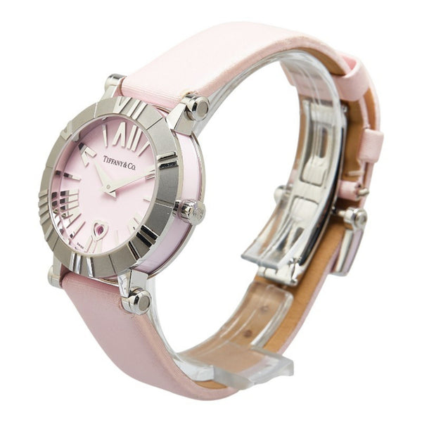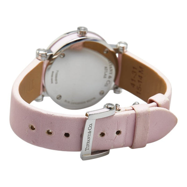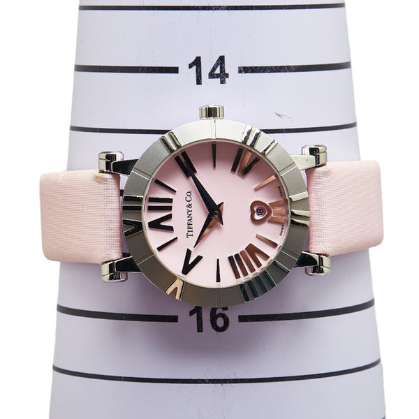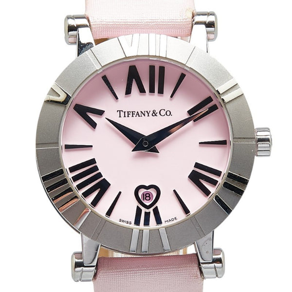 Tiffany & Co. Atlas Heart Date Quartz Watch with Pink Dial, Stainless Steel and Leather Strap for Women.