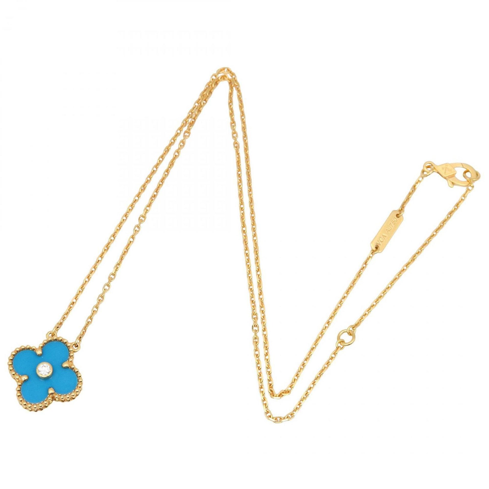 Van Cleef & Arpels Vintage Alhambra Blue Sable Necklace (1PD) in 18K Yellow Gold with Diamonds. Available Blue, Clear, and Gold. VCARP46000.